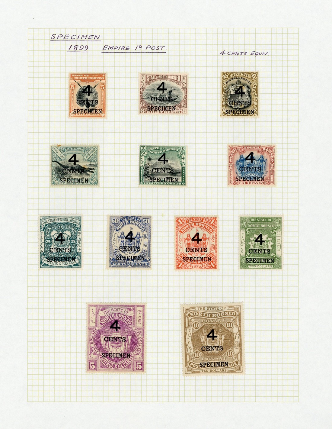 1899 (July-Oct.) 4c. on 5c. to 4c. on $10 set of twelve plus the three unissued values, each overprinted "specimen", the 6c. and 12c. with some tone spots otherwise fine. S.G. 112s-124s, £355