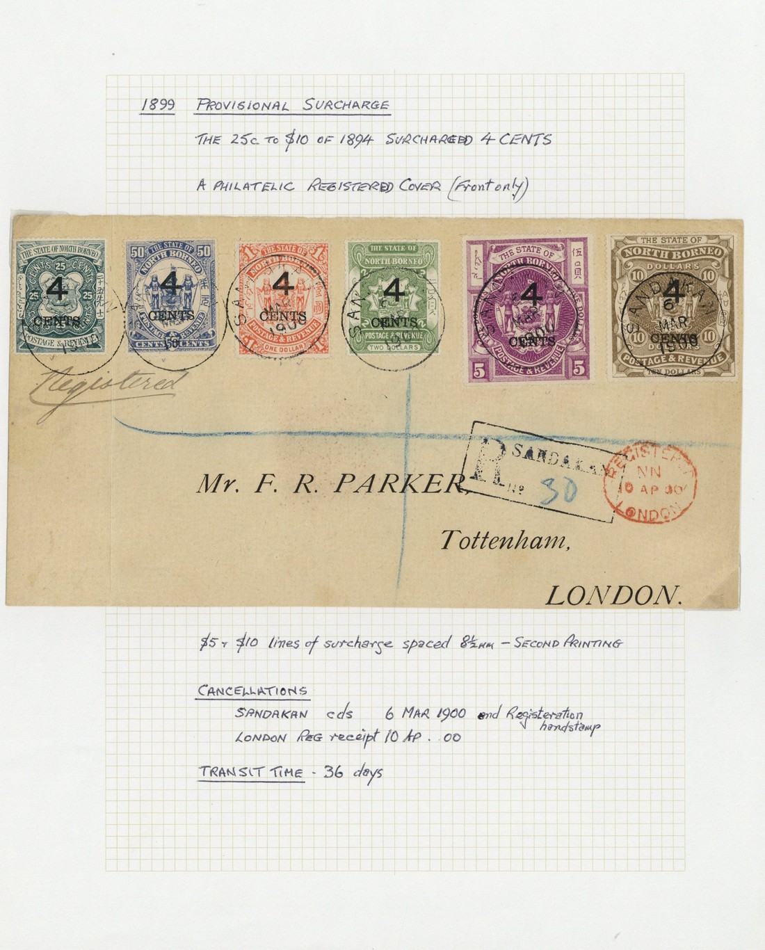 — 4c. on 5c. to 4c. on $10 set of twelve plus 4c. on 50c. chalky blue with additional 5c., 6c., 12c. (2), 18c. and 24c., 8½mm. spacing 4c. on $5 and 4c. on $10, mostly fine mint; 4c. on 5c. to 4c. on $2 with additional 5c. (3), 6c., 8c., 12c. and 24c. (2), plus 4c. on 25c. to 4c. on $1 and 8½mm. setting 4c. on $5 and 4c. on $10 all on 1900 (6 Mar.) Parker envelope registered from Sandakan to London, all used, mostly fine. S.G. 112-126, £1000+