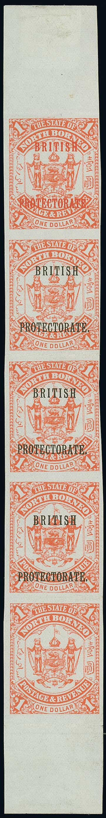 $1 scarlet, an imperforate vertical strip of five with margin at top and at foot, the first stamp with overprint in red, the second, third and fourth rows with overprint in black, and the fifth row without overprint, no gum, horizontal crease in bottom selvedge, fine. Photo