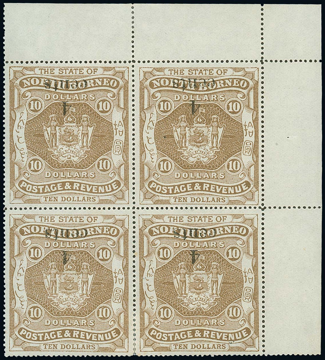 4c. on $10 top right corner block of four, variety surcharge inverted, fine mint. Each with D. Field h.s. in violet on reverse, none of which affect superb appearance. An extremely rare multiple. S.G. 157a, £12,000. Photo