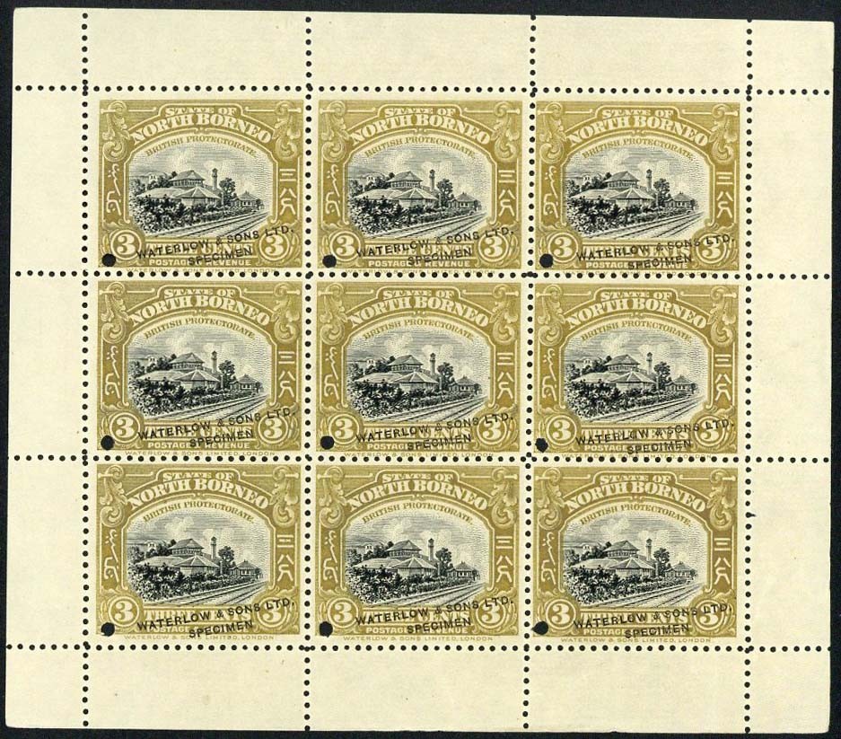 3c. in black and bistre, a sheet of nine each overprinted "waterlow & sons ltd./specimen" and with a small punch hole at lower left, fine
