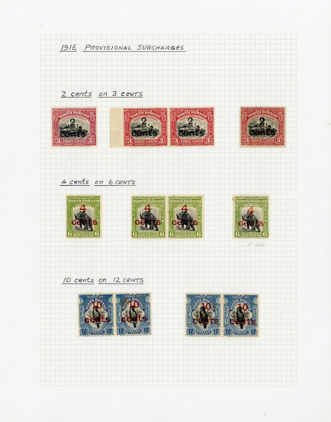 1916 (Feb.) 2c. on 3c. (2, one with "s" inverted), 4c. on 6c. and 10c. on 12c., all overprinted "specimen"; 2c. on 3c. (7 including a pair with "s" inverted - no gum, and one with damaged "s"), 4c. on 6c. (9 including a pair with "s" inverted and a strip of three with one showing damaged "s") and 10c. on 12c. pairs (3, one with one showing "s" inverted), all mint, some tone spotting in places. S.G. 186-188, £1200+