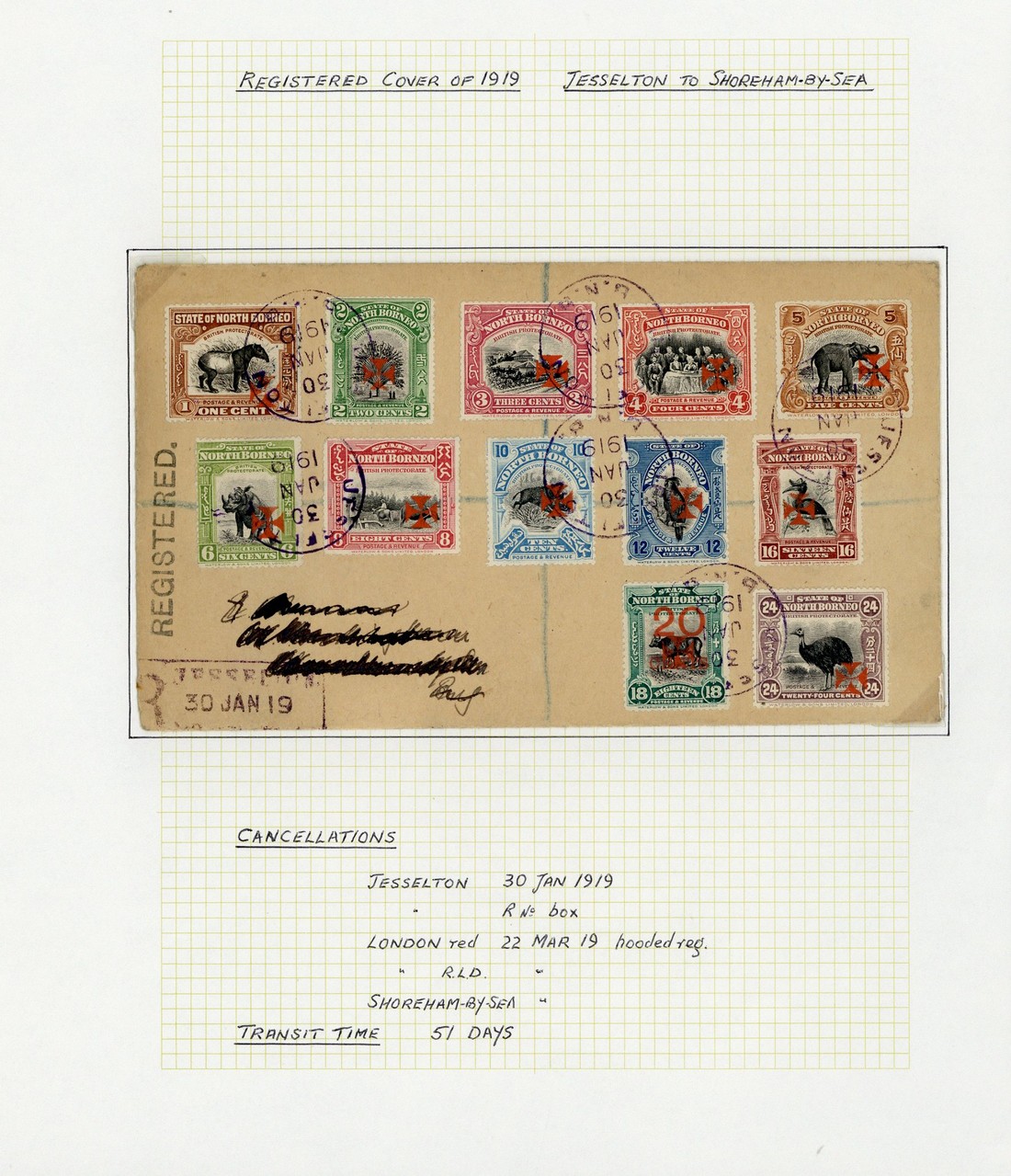 1c. to 24c. each tied by Jesselton c.d.s. on 1919 (30 Jan.) envelope registered to England (name and address deleted), fine. S.G. 189-200, £897