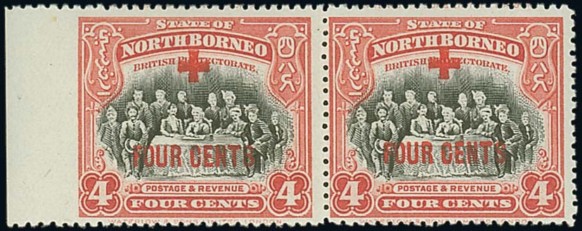 4c. black and scarlet horizontal pair with margin at left, variety imperforate between stamp and margin, fresh and fine mint. S.G. 238 var. Photo