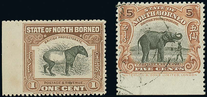 1c. black and chocolate-brown with margin at left, variety imperforate between stamp and margin, unused without gum, and 5c. black and yellow-brown with imprint margin at foot, variety imperforate between stamp and margin, fine used. S.G. 277 var, 281 var. Photo