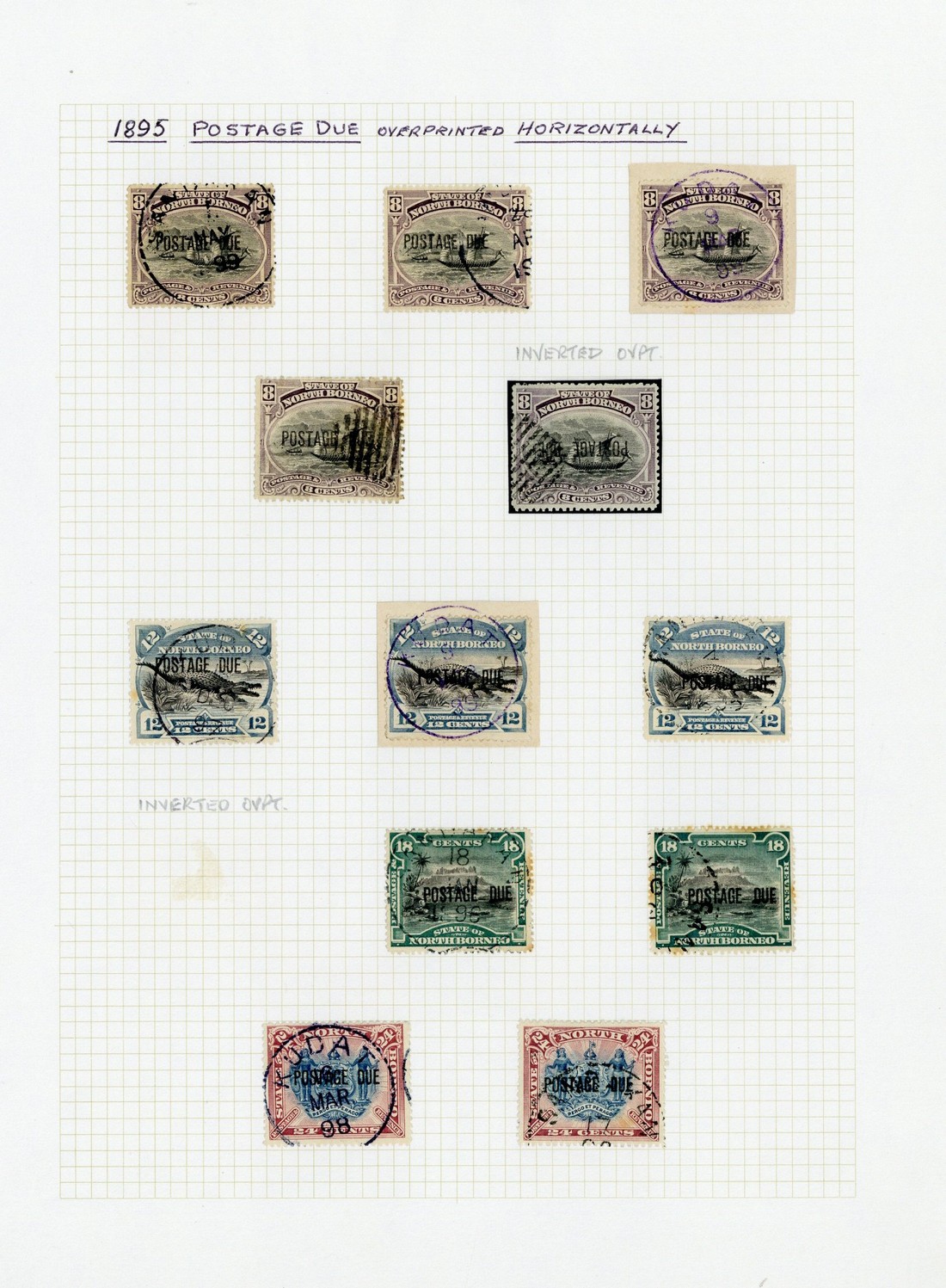 — 2c. (5, one with overprint reading downwards - stained, cto), 3c. (7), 5c. (5, one with overprint double - thinned), 6c. (3), 8c. (5, one with overprint inverted - cto), 12c. (3), 18c. (3, one with overprint vertical reading upwards) and 24c. (2), all with postal cancellations, a few with stains though many are fine. S.G. D1-D11, £2800+