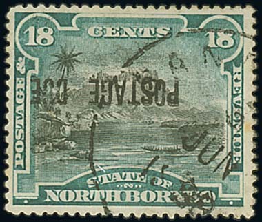 — 18c. black and deep green, variety overprint inverted, cancelled by part Sandakan c.d.s., fine. S.G. D10a, £400. Photo