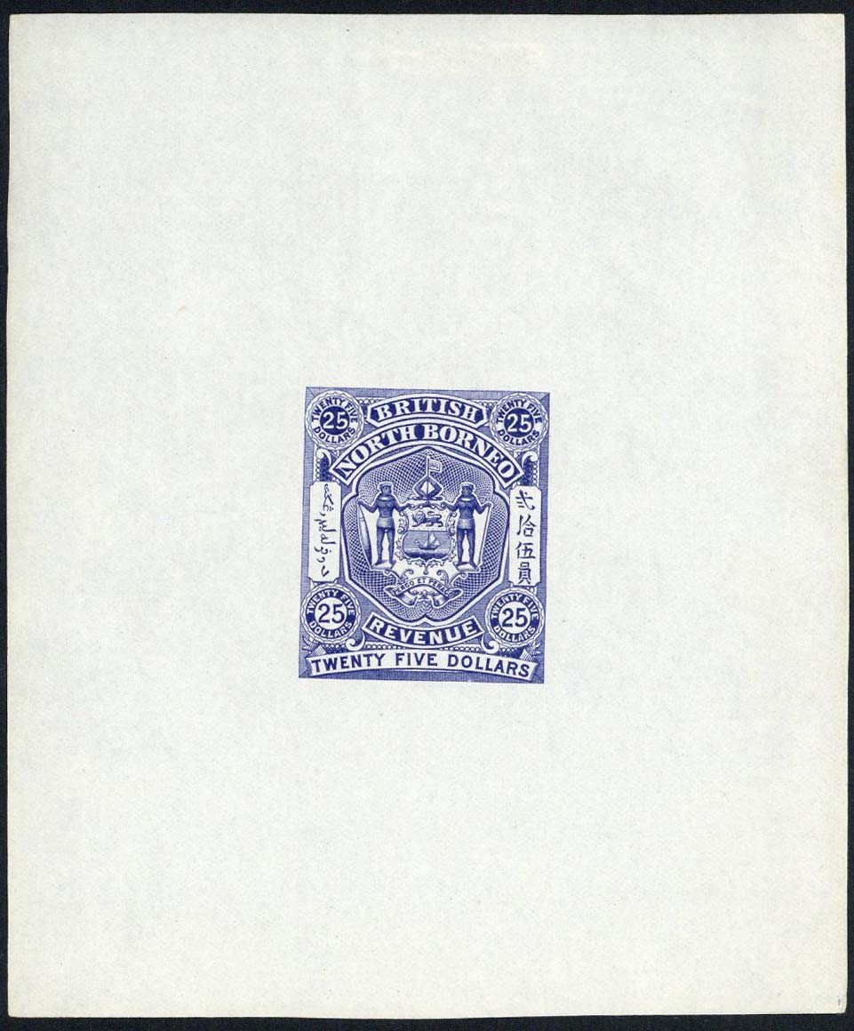 $25 colour trial die proof in deep blue on thin wove paper (120x143mm.), fine