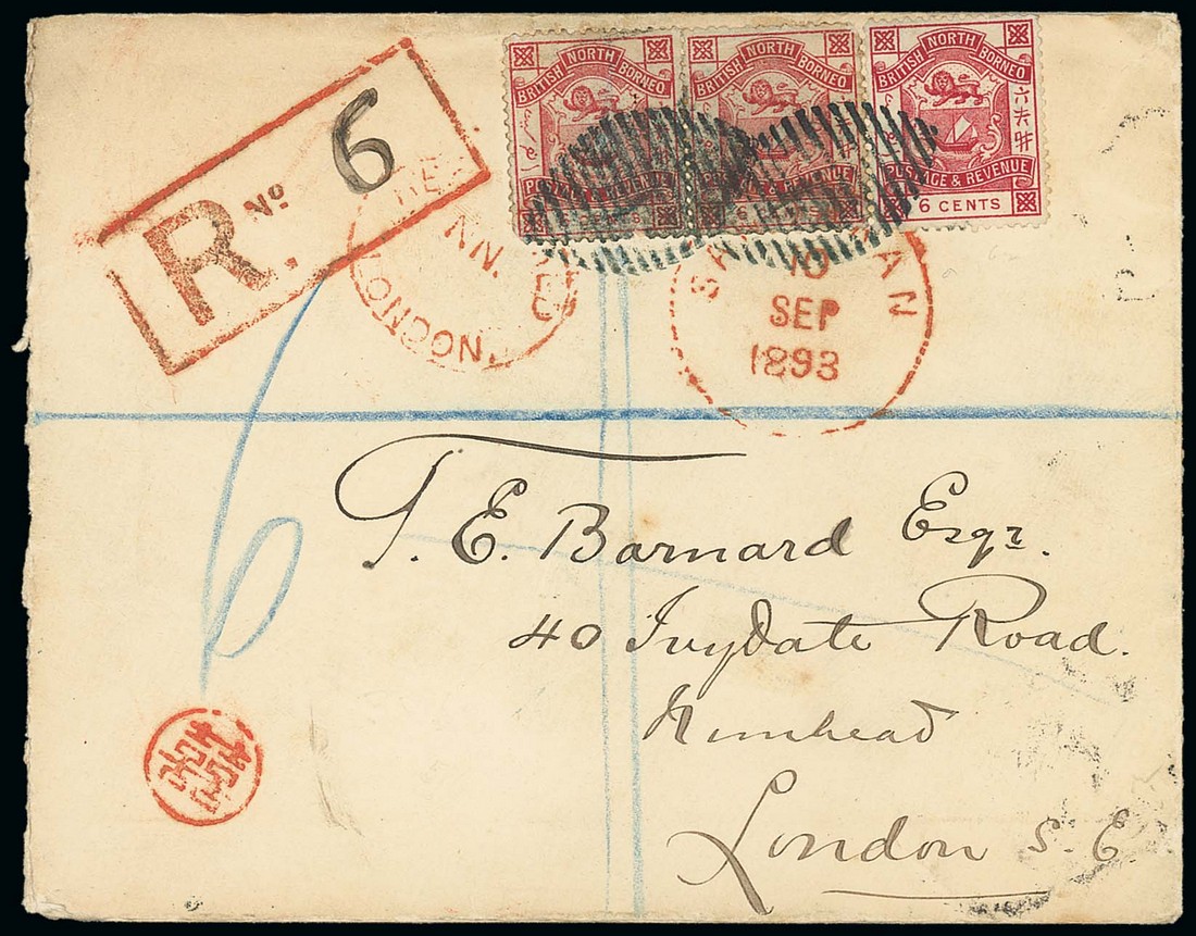 1893 (10 Sept.) envelope registered to London, bearing 1892 6c. lake (3), all tied by oval of bars (Type K4) and Sandakan c.d.s. in red (Type D4), showing registration h.s. (Type R2) and arrival d.s., both also in red. An attractive franking. Photo
