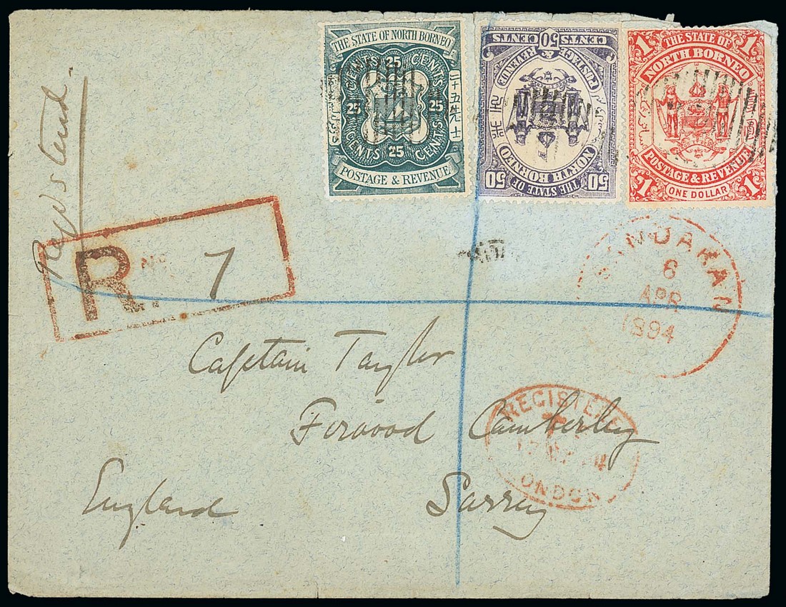 1894 (6 Apr.) envelope registered to London, bearing 1894 25c., 50c. and $1, each cancelled by oval of bars, showing Sandakan c.d.s., registered h.s. and arrival d.s., all in red. Photo