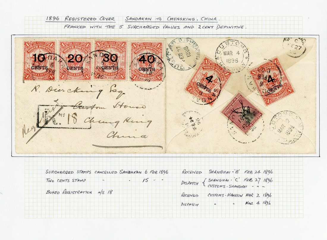 1896 (6 Feb.) envelope (opened-out) registered to Chungking, bearing 1895 10c. on $1 to 40c. on $1 with, on reverse, 4c. on $1 (2) and 1894 Pictorial 2c., all tied by Sandakan c.d.s., showing registration h.s. with, on reverse, Shanghai (27.2), Customs Shanghai (27.2) and Customs Hankow (2.3 and 4.3) transit d.s.