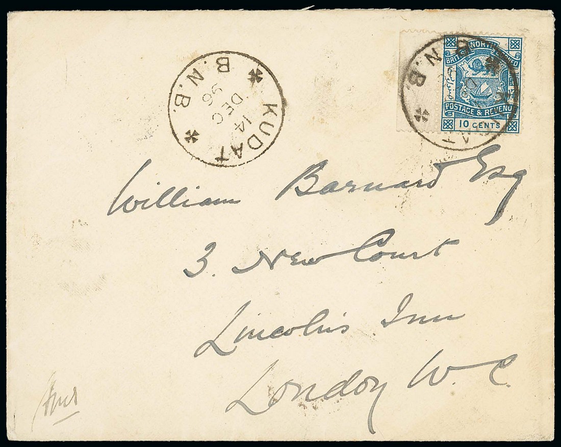 1896 (14 Dec.) envelope to London, bearing 1891 10c. tied by "kudat/b.n.b." c.d.s. (Type D5), showing another strike alongside and, on reverse, Labuan transit d.s.; the envelope with part flap missing. Photo