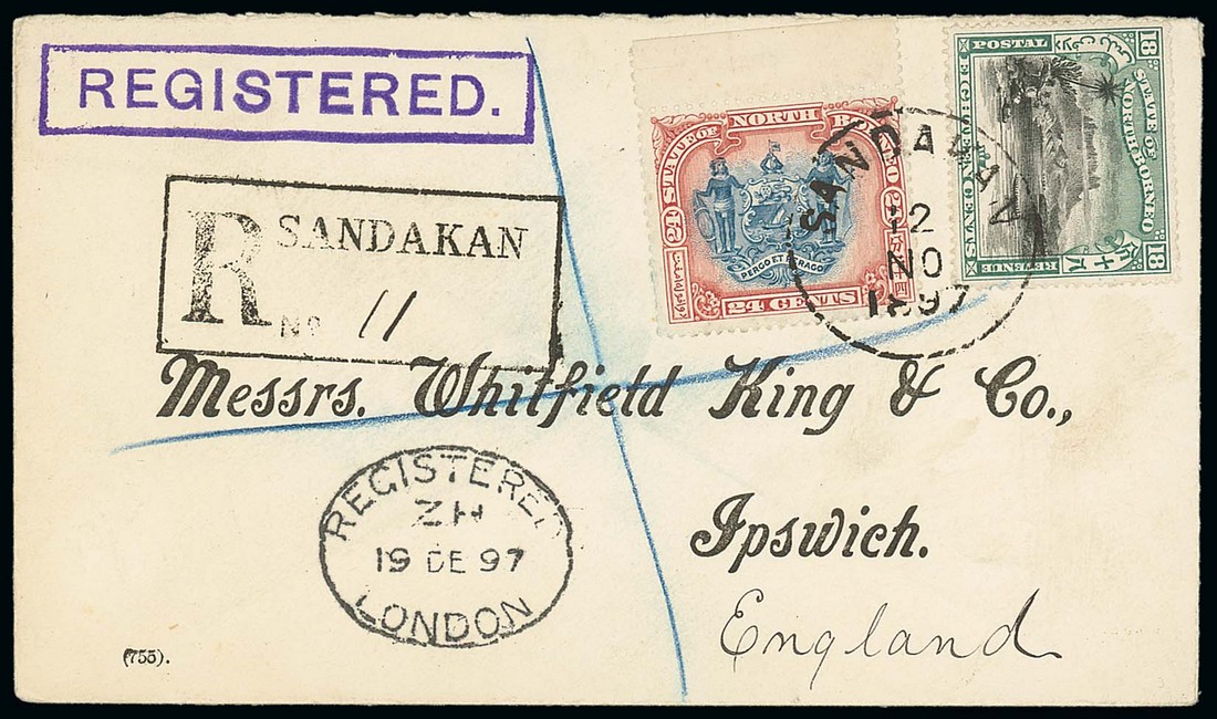 1897 (12 Nov.) "Whitfield King" envelope registered to Ipswich, bearing 1897 Pictorial 18c. and 24c., both tied by Sandakan c.d.s. and showing fine registration h.s. Photo