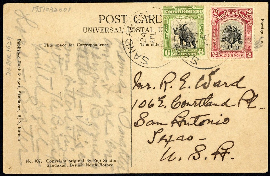 1929 (24 Apr.) picture postcard (Sandakan Boat Quay) from Sandakan to Texas, bearing 1925-28 2c. and 6c. clearly tied by c.d.s., fine