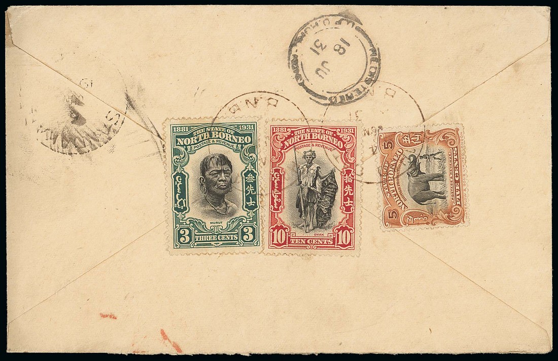 1931 (4 June) envelope registered to Hong Kong bearing, on reverse, 1925 Pictorial 5c. and 1931 Anniv. 3c. and 10c., all tied by "lahad datu/b.n.b." c.d.s., showing Sandakan transit c.d.s. alongside with registration label on face. Photo