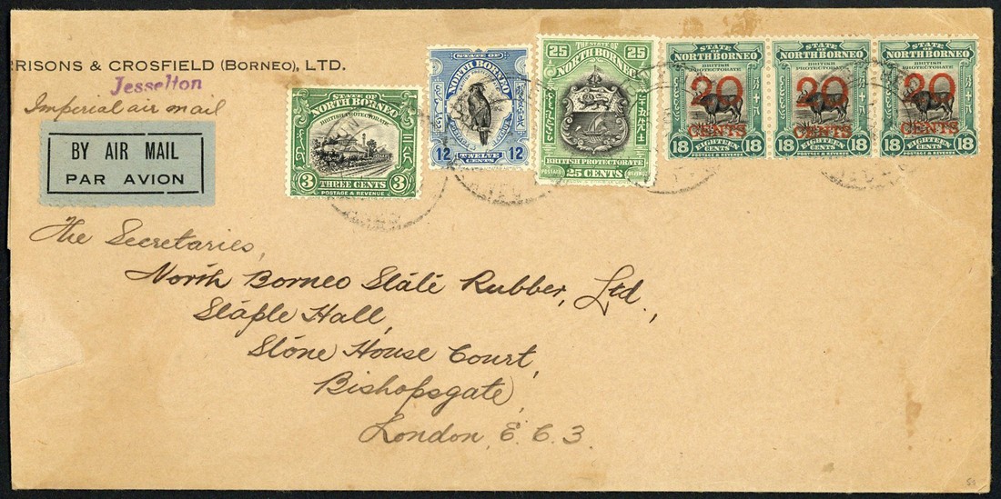 1937 quadruple rate envelope to London, marked "Imperial air mail", bearing 1925-28 Pictorial 3c., 12c., 20c. on 18c. strip of three and 25c., all tied by Jesselton double-ring d.s.; the envelope with tear across back panel