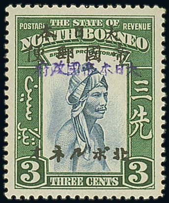 3c. slate-blue and green with additional Type 1 handstamp in violet, a fraction gum toned, fine mint. S.G. J22a, £450. Photo