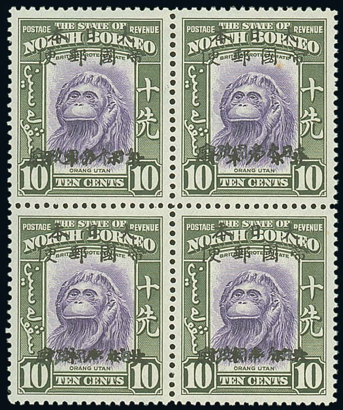 10c. violet and bronze-green, a block of four with additional Type 1 handstamp in black, fine mint. S.G. J26b, £1000. Photo