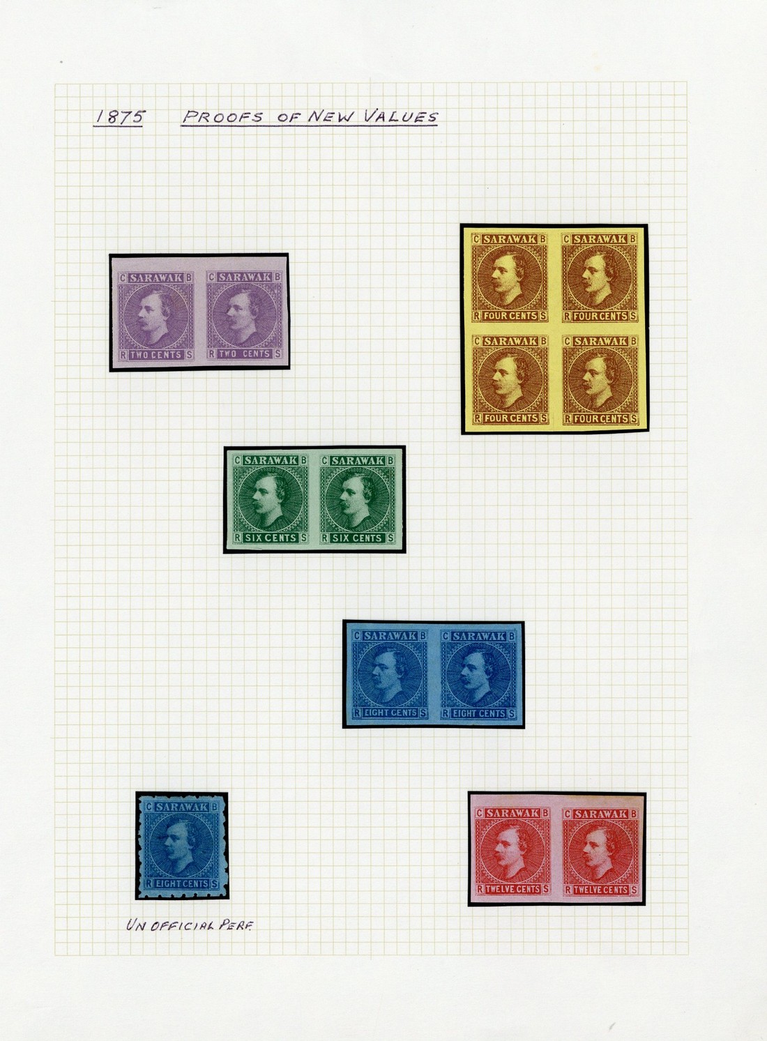 1875 2c., 6c., 8c. and 12c. pairs and 4c. block of four (vertical crease at left), each an imperforate plate proof in issued colours, fine; also 8c. clandestinely perforated