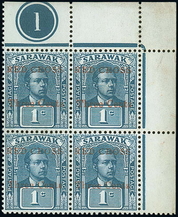 1918 unissued "red cross/Three Cents" in black and in red on 1c. top right corner blocks of four with plate number, the latter with some very minor staining on reverse and a fraction soiled in selvedge, otherwise fine unmounted mint. Photo