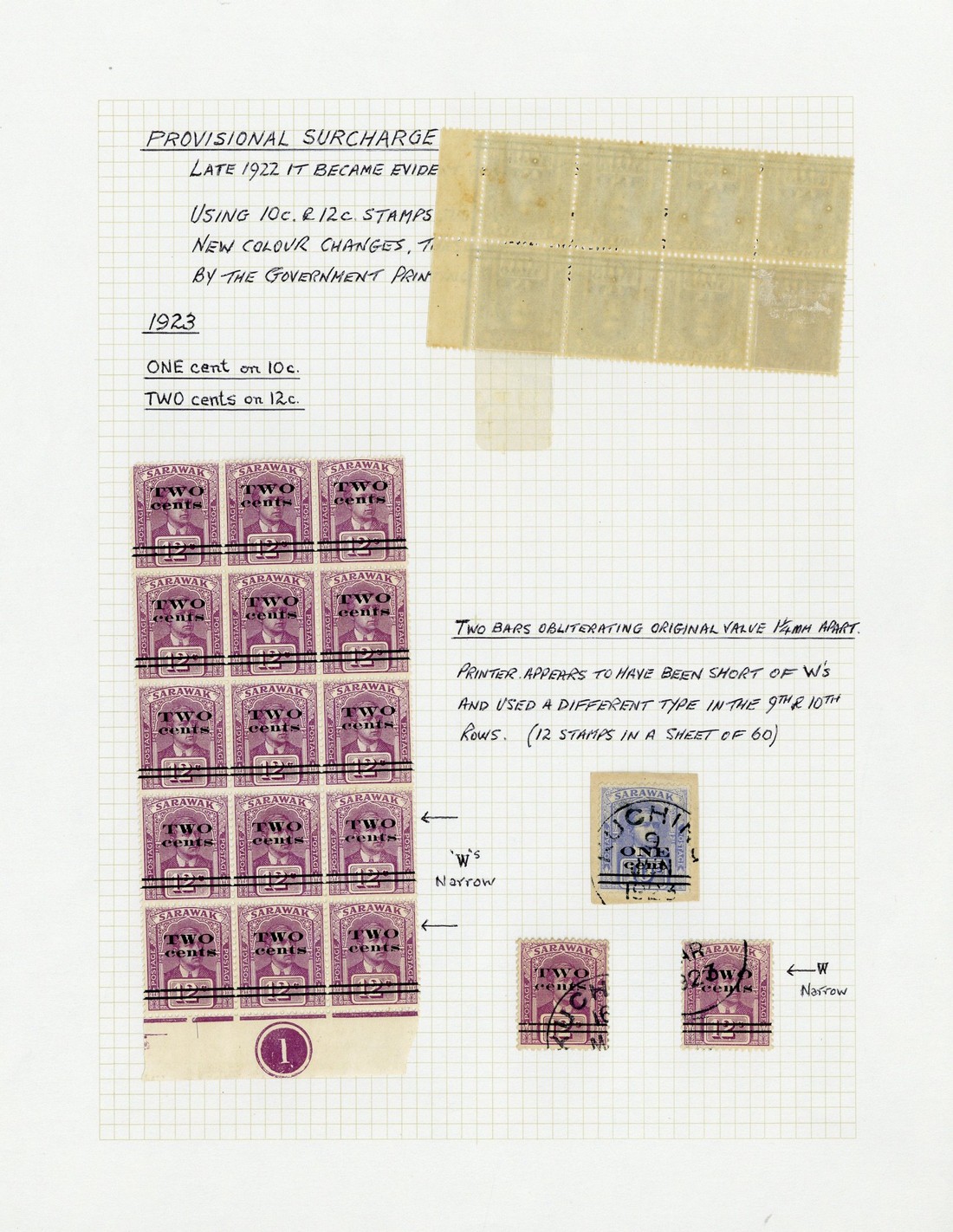 First printing, bars 1¼mm. apart 1c. on 10c. mint marginal block of eight (4x2) and a used single on small piece, and 2c. on 12c. mint marginal plate number block of fifteen (3x5) with the bottom two rows showing narrower "w" in "two" and two used singles, one showing narrower "w"; second printing bars ¾mm apart 1c. on 10c. and 2c. on 12c. mint; fine. S.G. 72-75, £843
