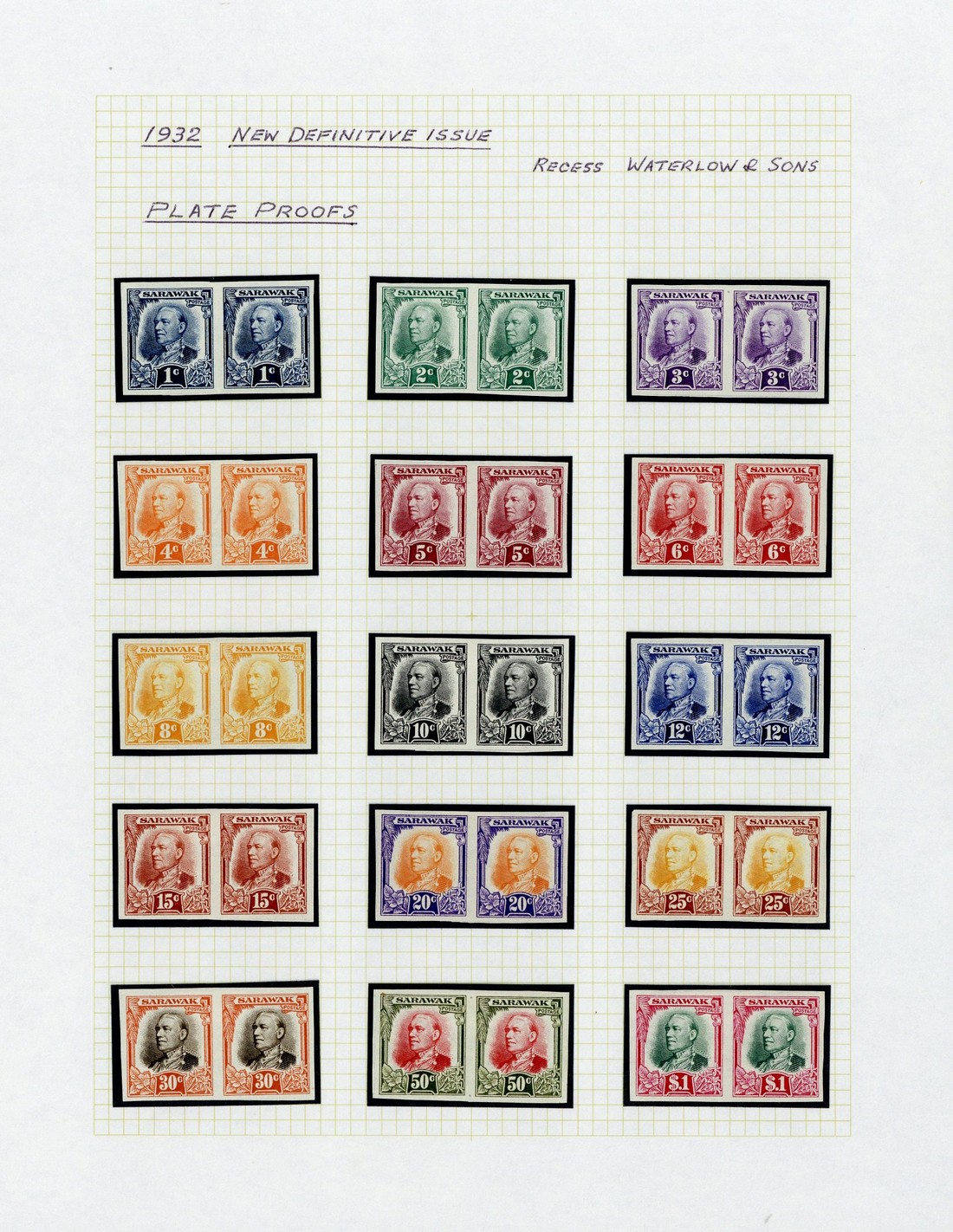 1932 1c. to $1 set of fifteen in imperforate plate proof pairs in issued colours on ungummed unwatermarked paper, fine. Most attractive