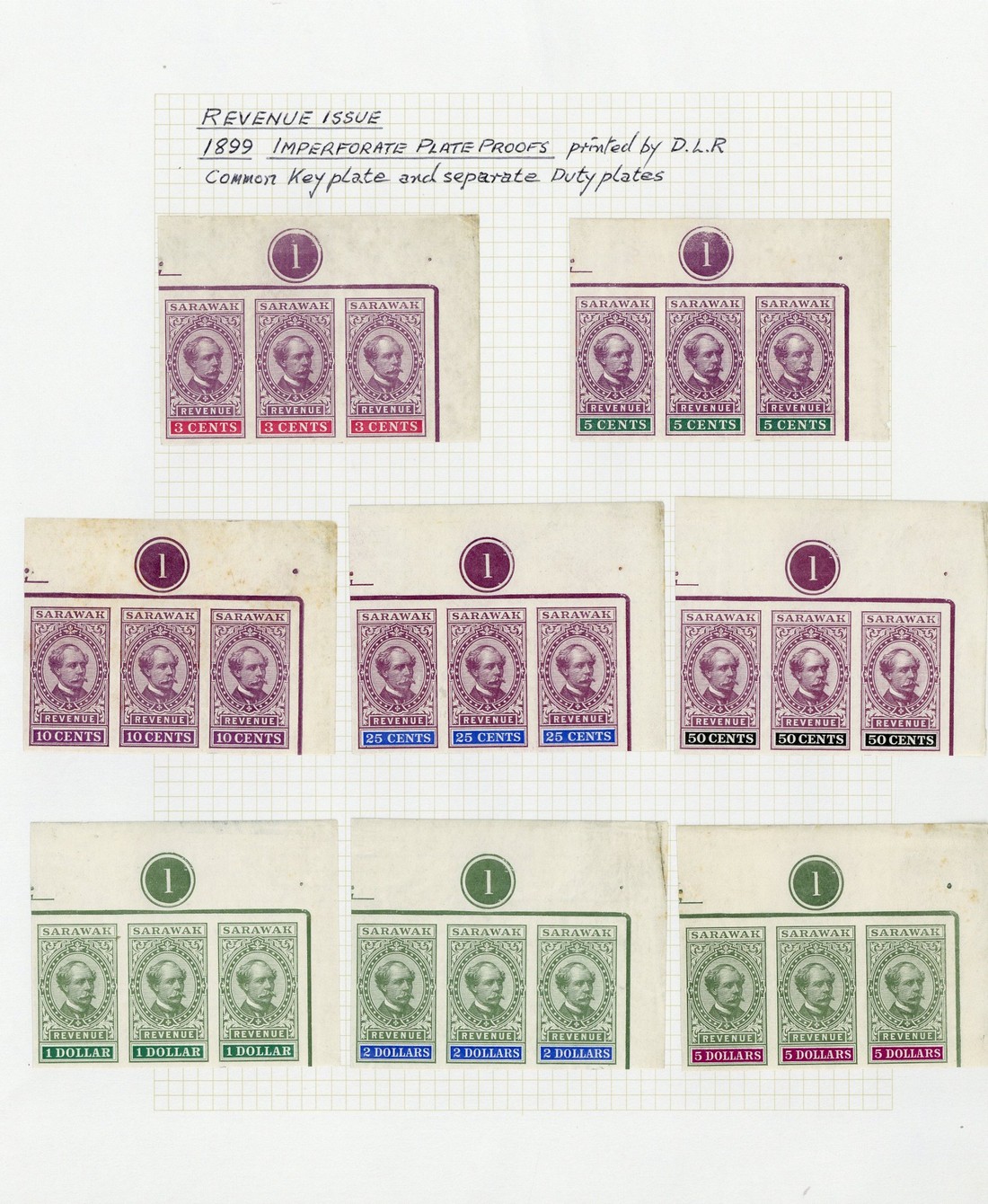 Revenue 1899 3c. to $2 and $5, each in a top right corner strip of three with plate number, all on gummed paper, the odd minor tone spot otherwise fine