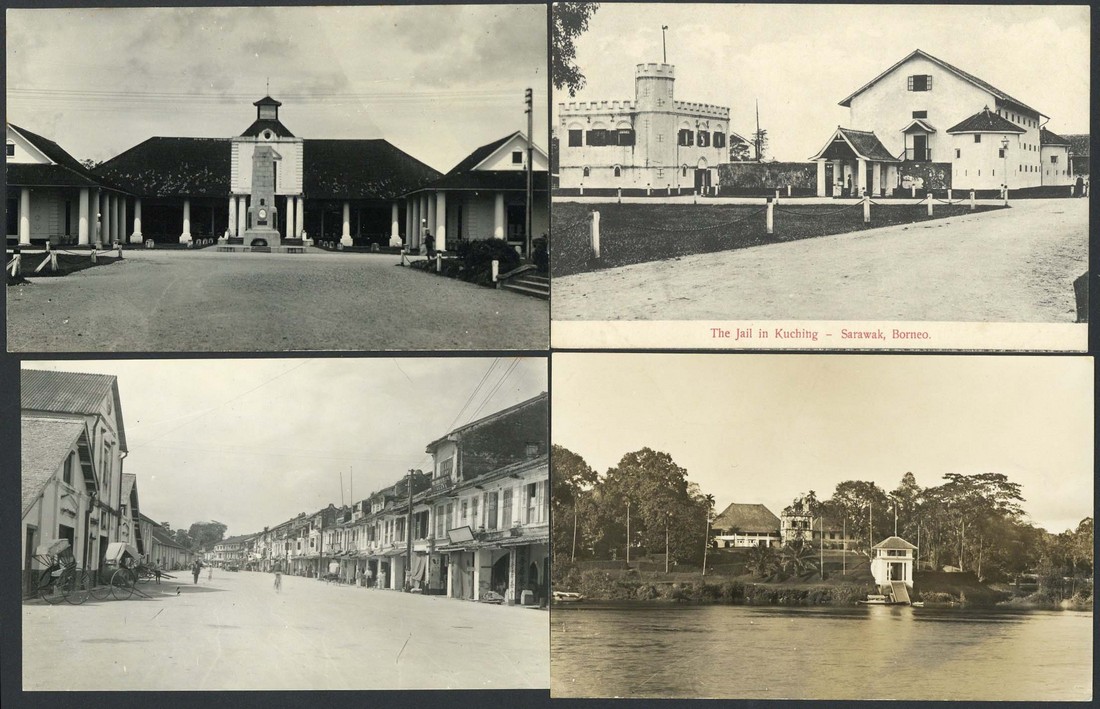 Seven unused photographic cards by unknown publisher, all but one with notation of scene on address side, also one ("The Jail in Kuching - Sarawak, Borneo") published by G.R. Lambert & Co., Singapore, unused. A fine lot