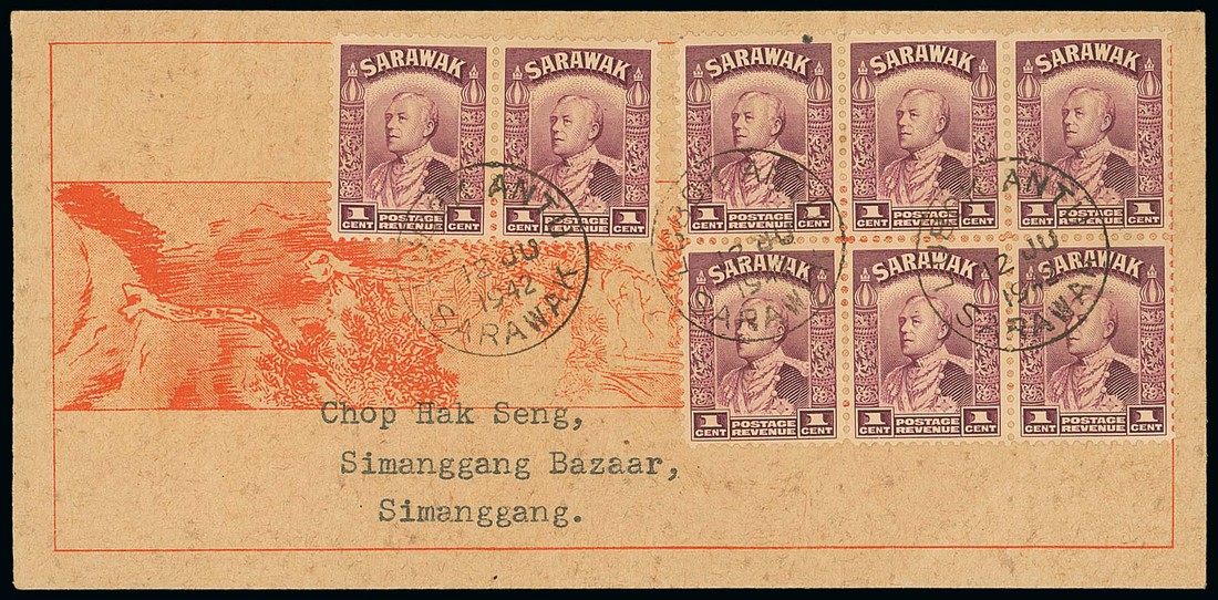 1942 (12 June) "red band" envelope to Simanggang, bearing 1934-41 1c. block of six and pair, all cancelled by "lubok antu/sarawak" c.d.s.; envelope with flap missing at left. Photo