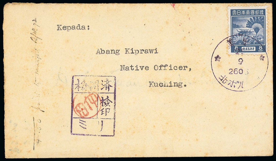 1943 (20 Sept.) envelope from Miri to Kuching, bearing North Borneo 1943 8c. tied by Type JD3 c.d.s. in violet and showing censor chop at left; the envelope a little tone spotted. Photo