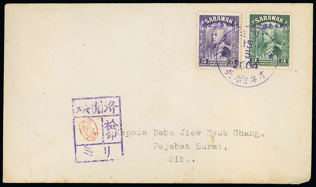 1944 (15 May) envelope to Sibu, bearing 1942 (Oct.) 3c. green and 5c. tied by Miri Japanese c.d.s. (Type JD4) in violet and showing censor chop. Photo