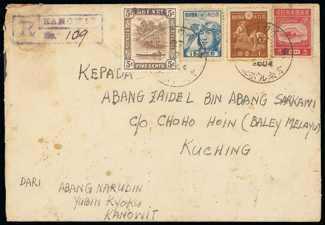 1944 (27 July) envelope registered from Kanowit to Kuching, bearing Brunei 5c. with violet h.s., North Borneo 1943 4c. and Japan 1s. and 30s., all tied by Japanese c.d.s. (Type JD3) and showing registration h.s. at upper left; a few small faults. Photo