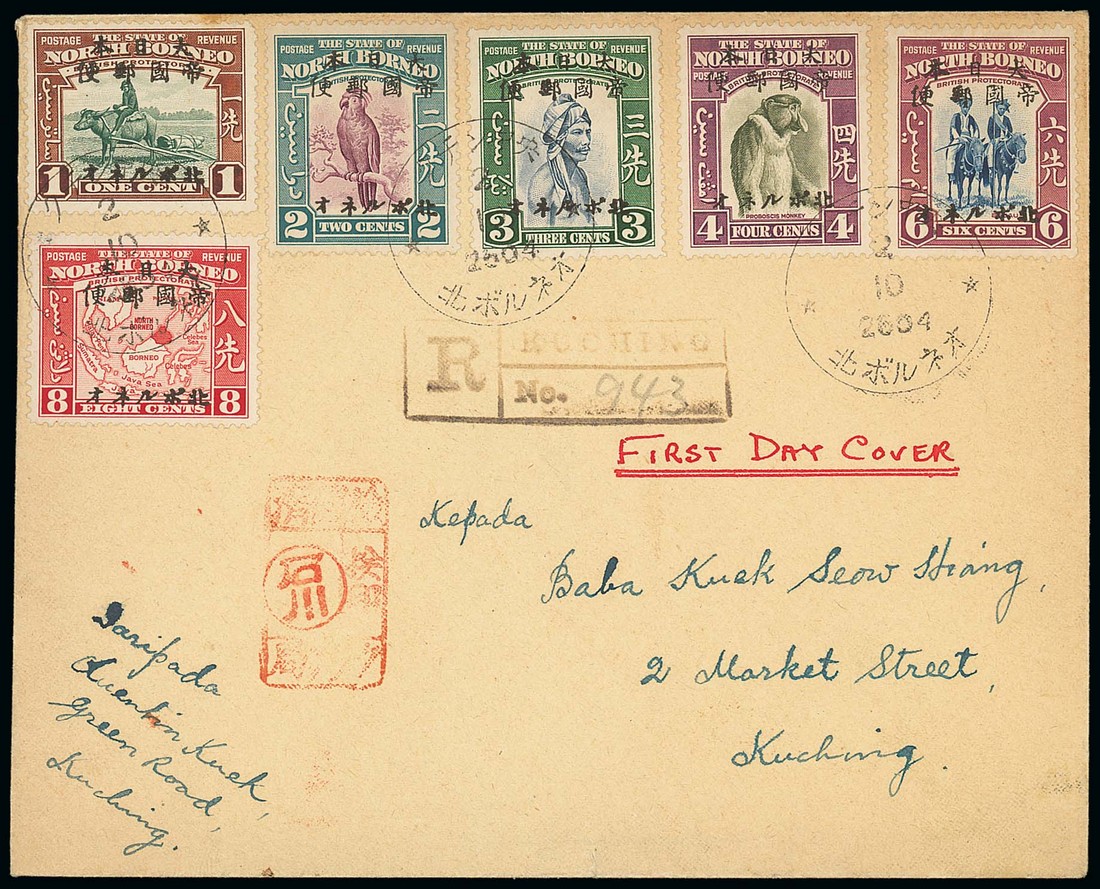 1944 (2 Oct.) locally addressed and registered envelope, bearing North Borneo 1944 (Sept.) 1c., 2c., 3c., 4c., 6c. and 8c., all tied by Kuching Japanese c.d.s. (Type JD4), showing registration h.s. and red censor chop. Photo