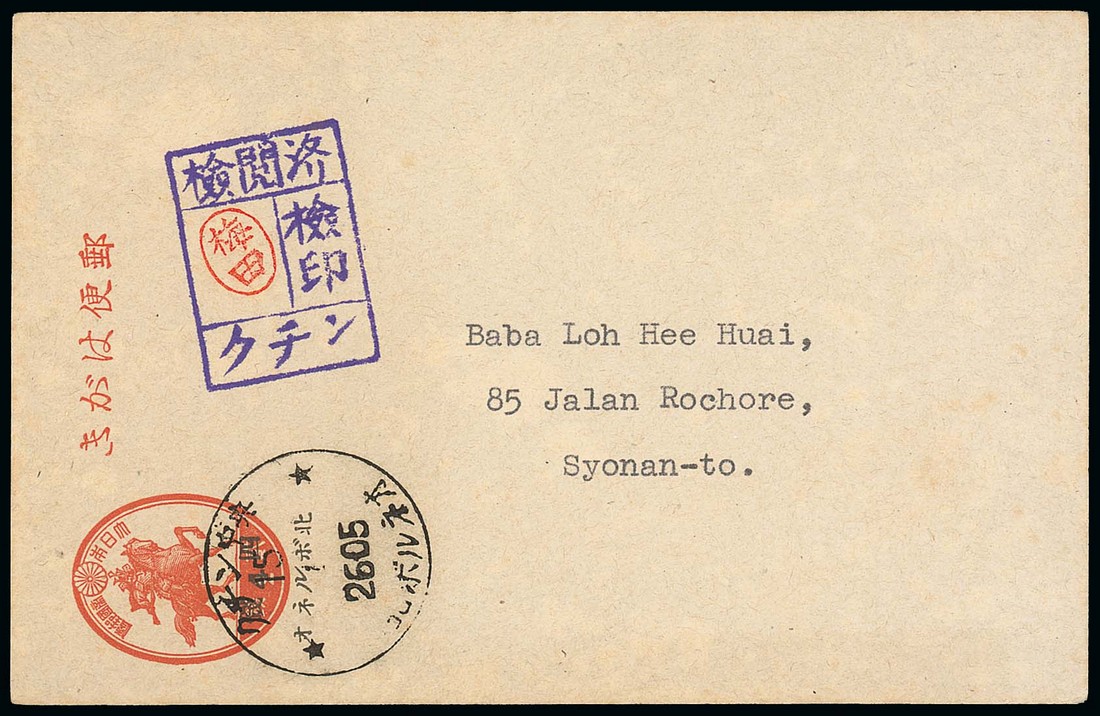 1945 (15 Jan.) Japan 2c. on 2s. mounted warrior stationery card from Kuching to Singapore, cancelled by Type JD4 c.d.s. and showing violet censor chop alongside, fine. Photo