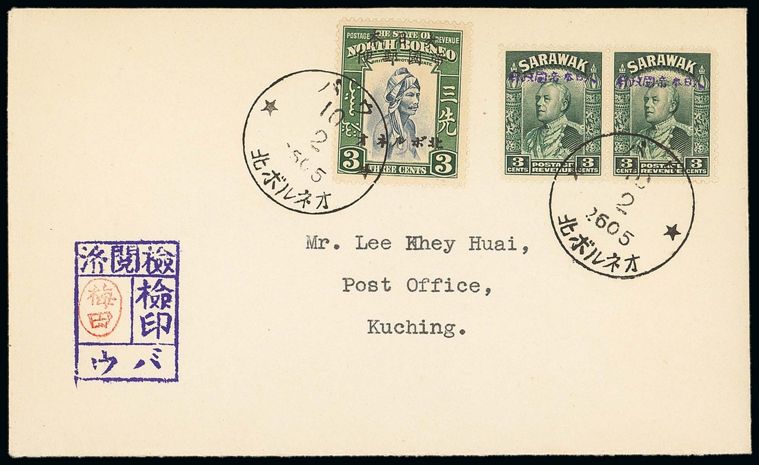 1945 (10 Feb.) envelope from Bau to Kuching, bearing 3c. green pair in combination with North Borneo 1944 (Sept.) 3c., both clearly tied by Japanese c.d.s. (Type JD3) and showing violet censor chop at lower left, fine. Photo
