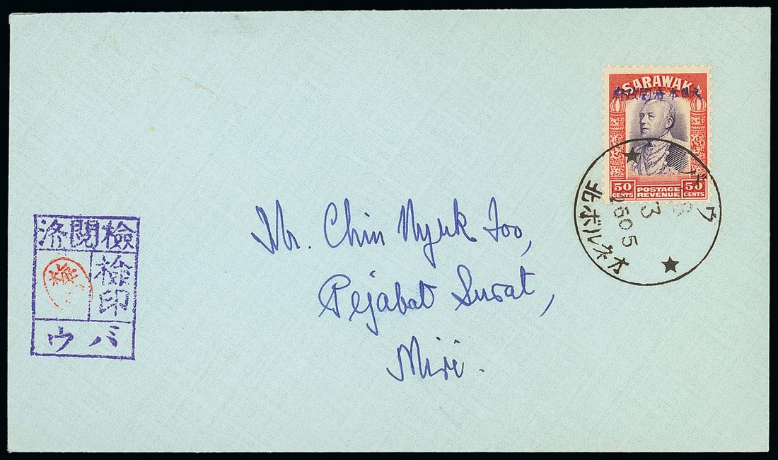 1945 (18 Mar.) envelope from Bau to Miri, bearing 50c. clearly tied by Japanese c.d.s. (Type JD3) and showing violet censor chop at left. Photo
