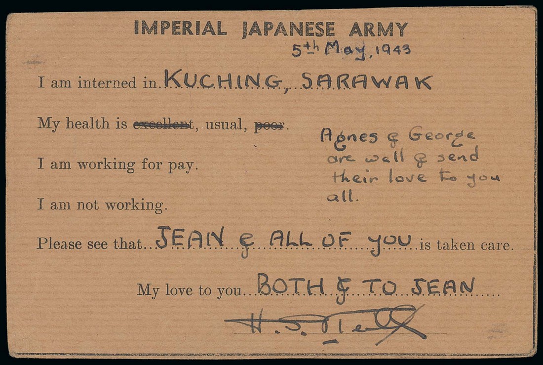 1943 (5 May) "imperial japanese army" card (Type 1) from civilian internee H.G. Keith, No. 2 Kuching Camp, to Canada showing censor chop with red seal of the camp commandant, Colonel Suga, and with arrival censor handstamp at left, fine. Photo