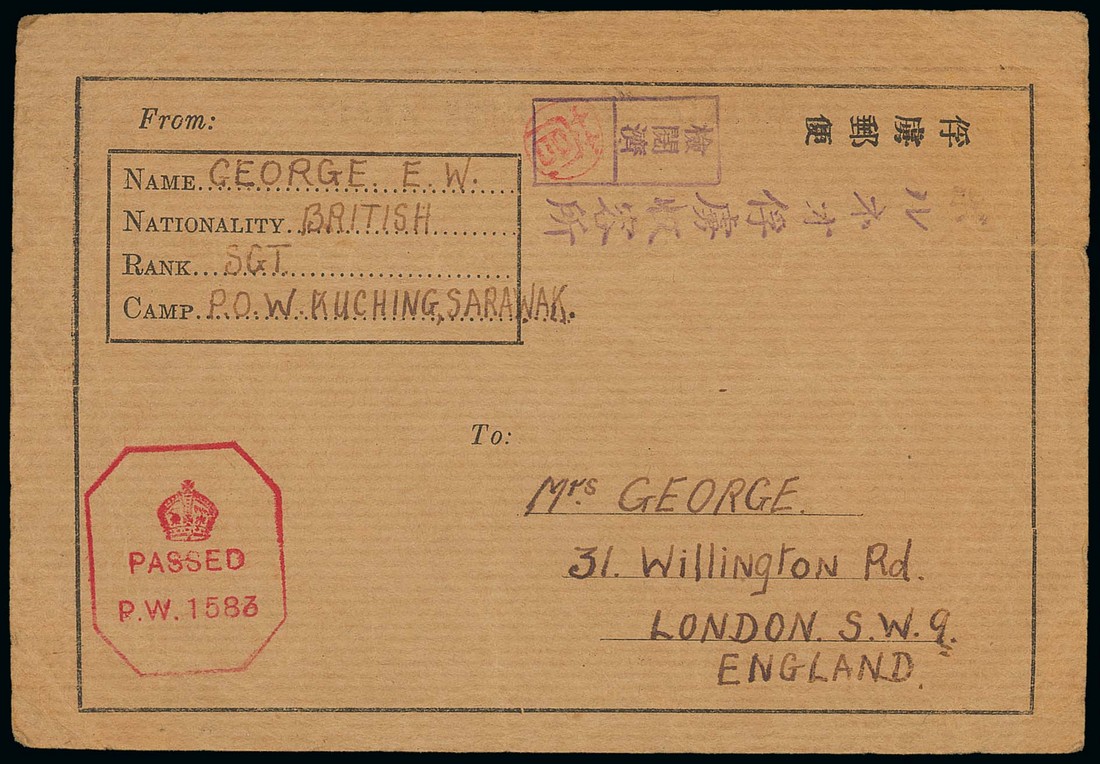 1943 (5 May) "imperial japanese army" card (Type 2) from Sergeant E.W. George, Kuching Camp, to London, showing censor chop with red seal of Colonel Suga and red arrival censor handstamp, some creases as usual. Photo