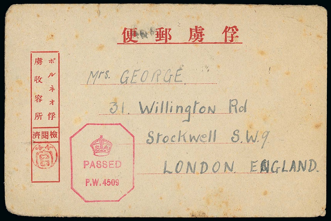 Undated card (Type 4) from Sergeant Edward George known to be held at Kuching Camp to London, showing red seal of Colonel Suga and red arrival censor handstamp; some minor staining. Photo