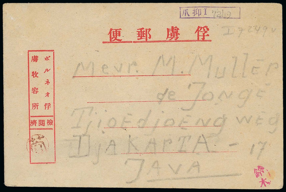 1943 (25 Dec.) card (Type 4) from a Dutch POW, L. Muller, at Kuching to his wife interned in Java, showing red seal of Colonel Suga, violet Java Internment District 1 chop at top right and red censor seal of Suzuki at lower right. The message is written in Malay as Dutch was not permitted. Very rare. Photo