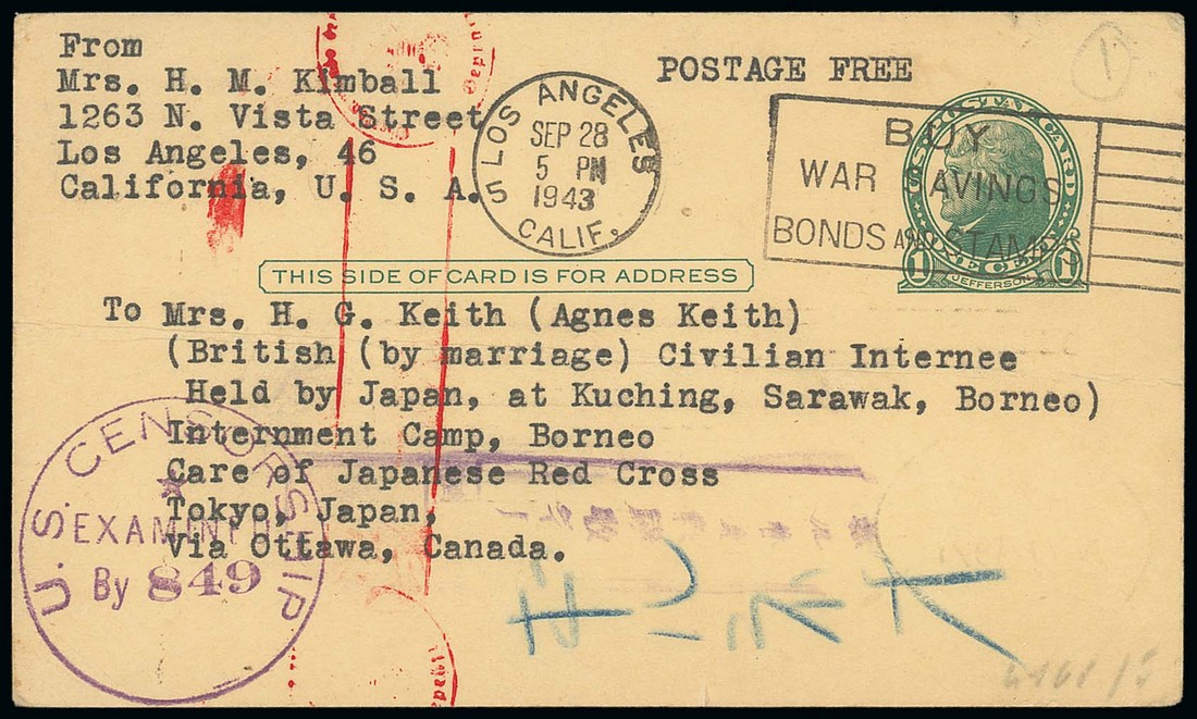 1943 (28 Sept.) US 1c. stationery card from Los Angeles to British civilian internee Agnes Keith at Kuching via Germany, marked "postage free", showing violet US censor h.s., red German censor h.s. and violet arrival censor chop with red seal of Kubo; the card with pressed horizontal crease. Also "Three Came Home" by Agnes Newton Keith. Photo