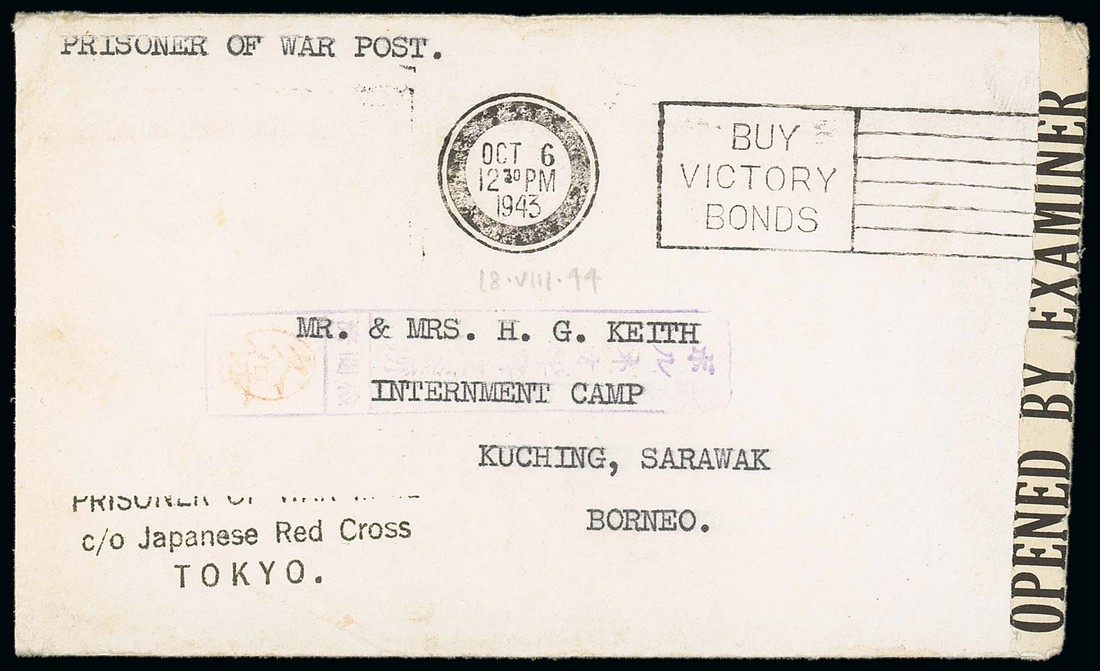 1943 (6 Oct.) envelope from Canada to British civilian internee Agnes Keith in Kuching, showing dumb despatch d.s. and censor label at right, "prisoner of war mail/c/o Japanese Red Cross/tokyo" h.s. at lower left and violet arrival censor chop with red seal of Kubo. Marked on the envelope is receipt date of 18 August 1944, 10½months after the cover was mailed. Photo