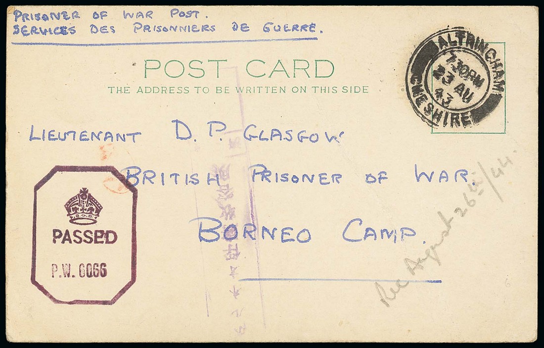 1943 (23 Aug.) post card from Altrincham to Lt. D.P. Glasgow to Borneo Camp, marked "prisoner of war post/services des prisonniers de guerre", showing despatch c.d.s., British censor h,s, and violet arrival censor chop plus manuscript notation "Recd August 26th/44"; the card with pressed creases. Photo