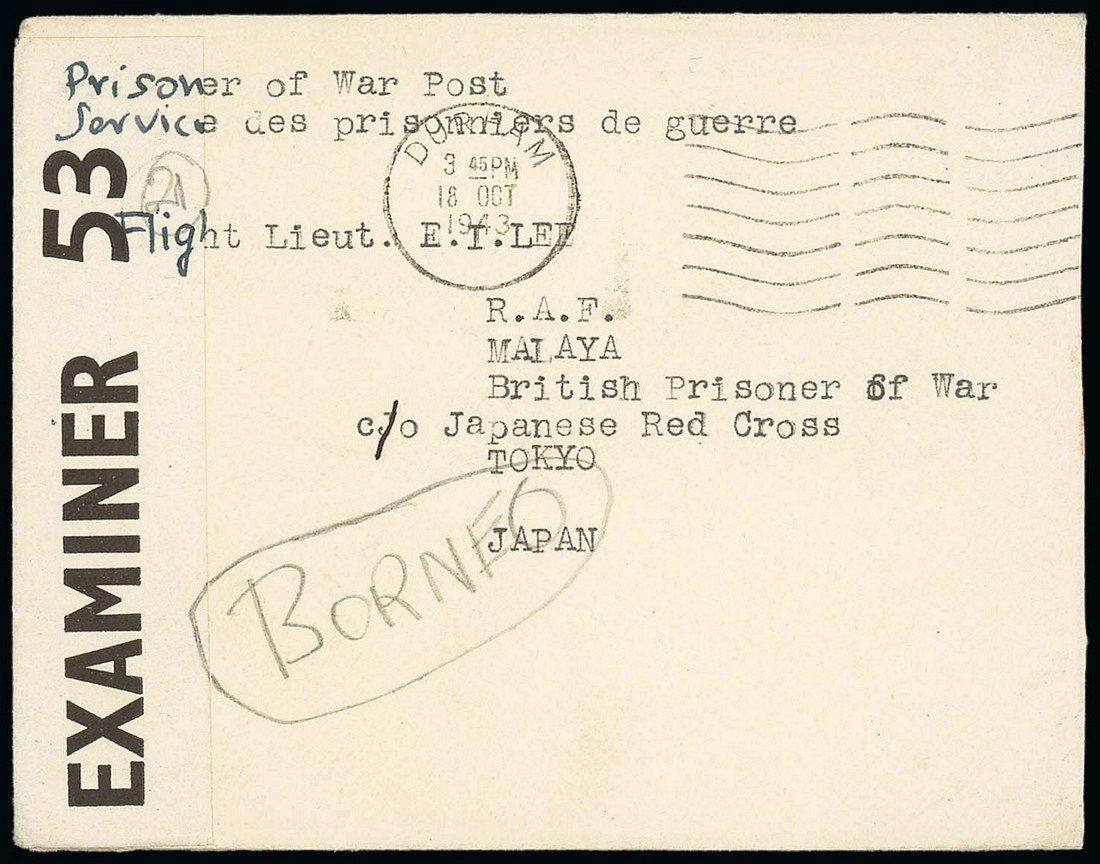 1943 (18 Oct.) envelope from Durham to Flt. Lt. E.T. Lee in Malaya and redirected to Borneo, marked "Prisoner of War Post/Service des prisonniers de guerre", showing despatch d.s. and Censor label at left and, on reverse, violet Borneo censor chop with red seal of Colonel Suga. Photo