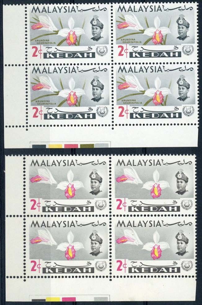 1965 Orchids 2c. lower left corner block of four with colour controls, variety dark green omitted, a very slight trace of toning otherwise fine unmounted mint. A key positional multiple. S.G. 116c, £1300