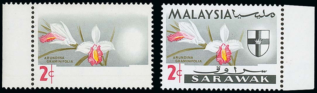 1965 (Nov.) Orchids 2c. (marginal) with black (country name and shield) omitted, unmounted mint; gum very slightly toned. With normal for comparison. S.G. 213a, £300. Photo
