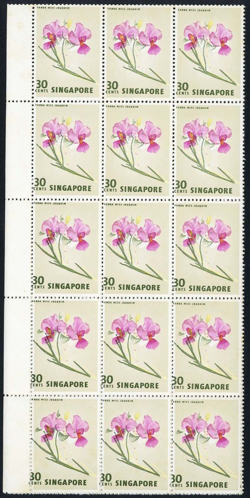 1962-66 6c. top left corner block of twenty (5x4) with top row showing strip of double paper on reverse; and 30c. block of thirty (3x10) with margin at left showing progressive shift of green to lower left. Also 1971 "Dish" Aerial 15c. marginal block of nine showing silver colour shifted upward by 2mm.. Unmounted mint