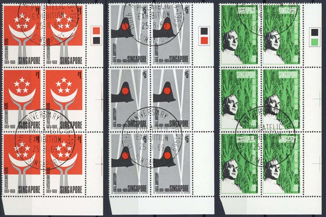 1969 (Aug.) 150th Anniv. of Founding of Singapore, 15c. to $10 set of six in lower right corner blocks of six (2x3), all cancelled by last day of Exhibition c.d.s., fine. S.G. 121-126, £540