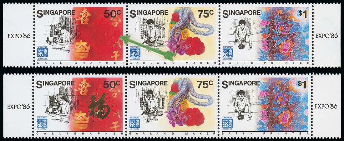 1986 (May) Expo '86 World Fair 50c., 75c. and $1 marginal se-tenant strip, the 50c. with gold omitted, fine unmounted mint. With normal for comparison. Unlisted. S.G. 528a. Photo