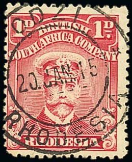 Red, neatly cancelled by virtually complete upright strike of the "odzi/rhodesia" double-ring datestamp for 20 January 1915; a superb and most attractive example of this scarce combined perforation. S.G. 208d, £550. Photo